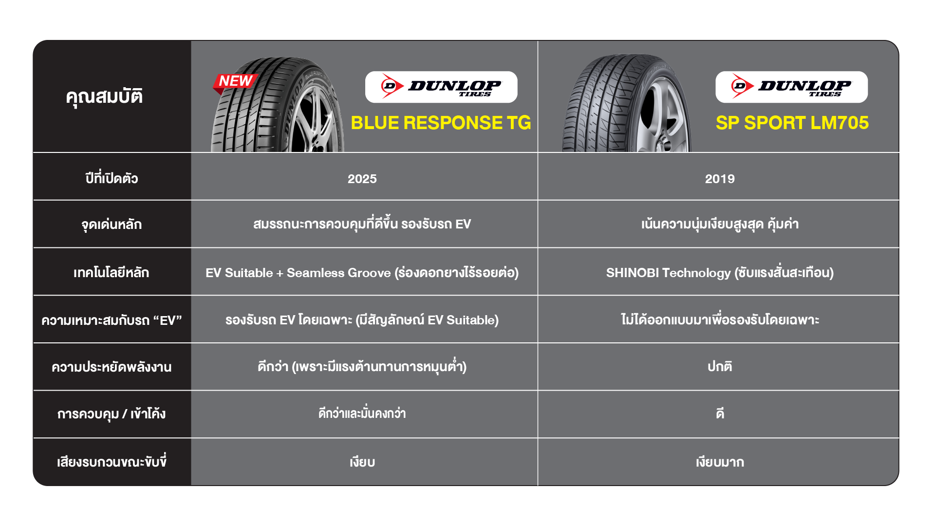ยาง DUNLOP เปิดตัวยางรุ่นใหม่ล่าสุด BLUE RESPONSE TG ที่พัฒนาต่อยอดจากยาง SP SPORT LM705 รองรับรถยนต์ไฟฟ้า และเพิ่มสมรรถนะการใช้งาน